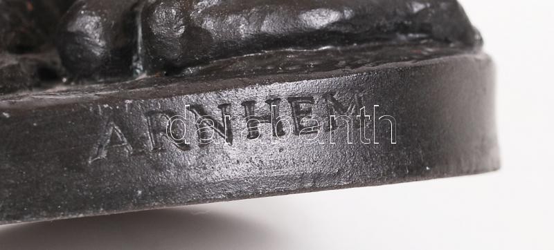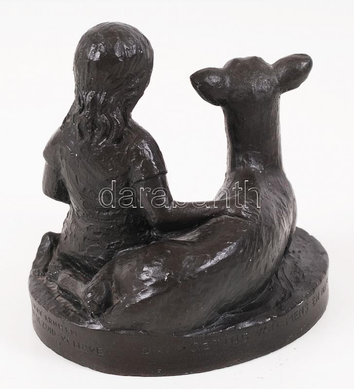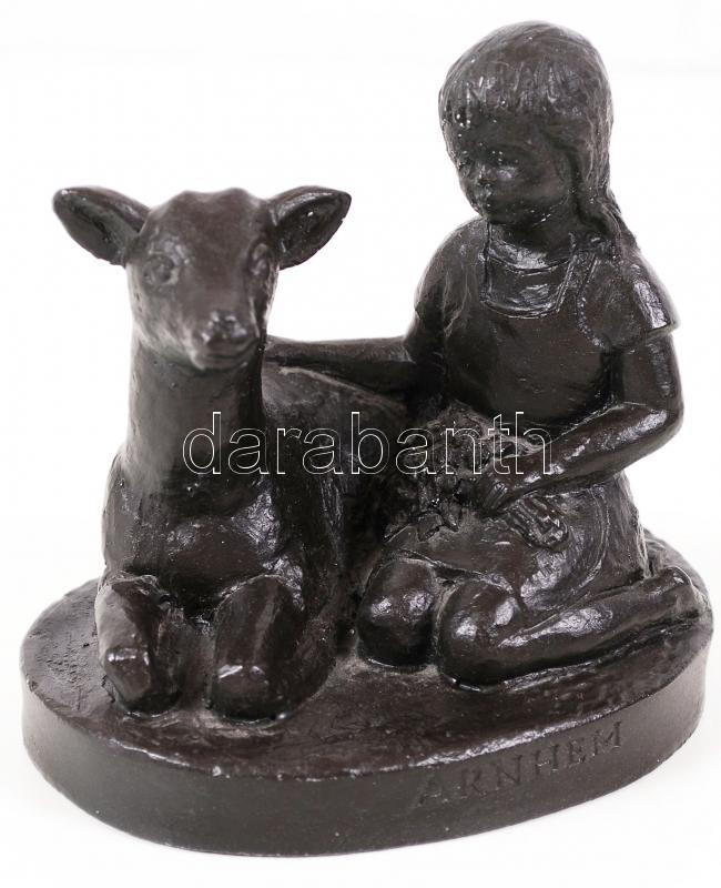 Arnhem jelzéssel: Kislány az őzikével. Festett kerámia, 12×12 cm