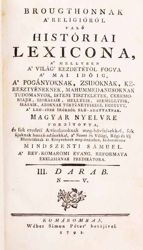 Description: Brougthonnak A' religióról való históriai lexicona, a' mellyben a' világ' kezdetétől fogva a' mai időig... Magyar nyelvre fordította mindszenti Sámuel. III. darab. Komárom, 1793, Wéber Simon Péter betüjivel. Kiadói bordázott gerincű egészbőr kötés, színezett lapszélek, kissé kopottas állapot.