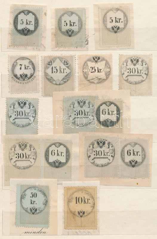 16 db nem érvénytelenített régi magyar okmánybélyeg részben kivágásokon