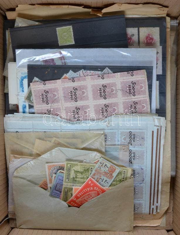 Kartondoboz, benne rengeteg átnézetlen és rendezetlen főleg magyar és kevés külföldi okmánybélyeg ívekben, ívdarabokban, borítékokban, okmánydarabokon, közte kevés levélzáró, segélybélyeg, stb érdekes vegyes anyag, érdemes megnézni!!