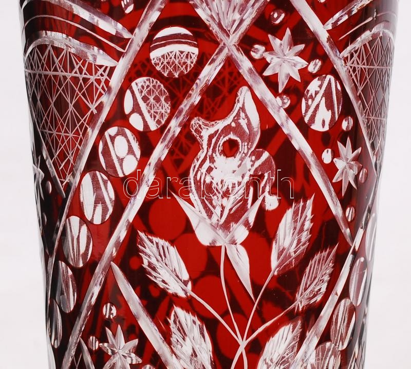 Többrétegű rubinvörös váza, csiszolt, metszett, hámozott, apró hibákkal, m:30 cm