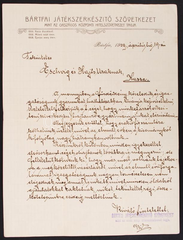 1909 Bártfa, Bártfai Játékszerkészítő Szövetkezet levele fejléces papíron
