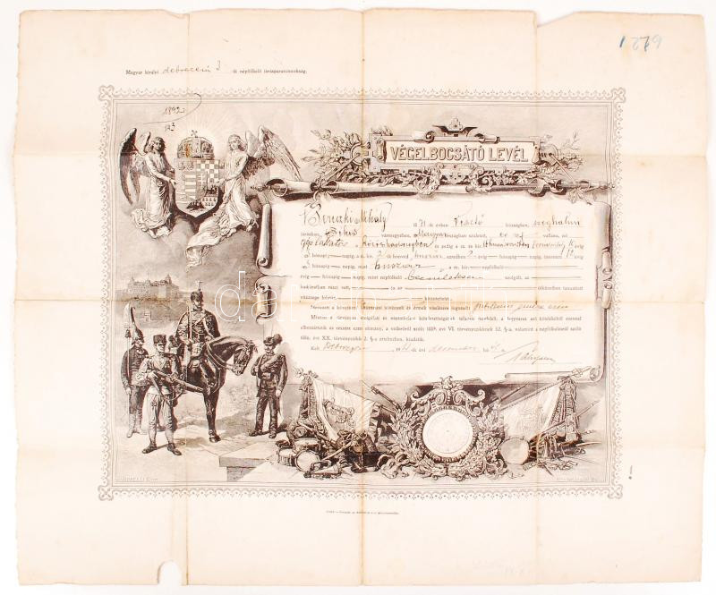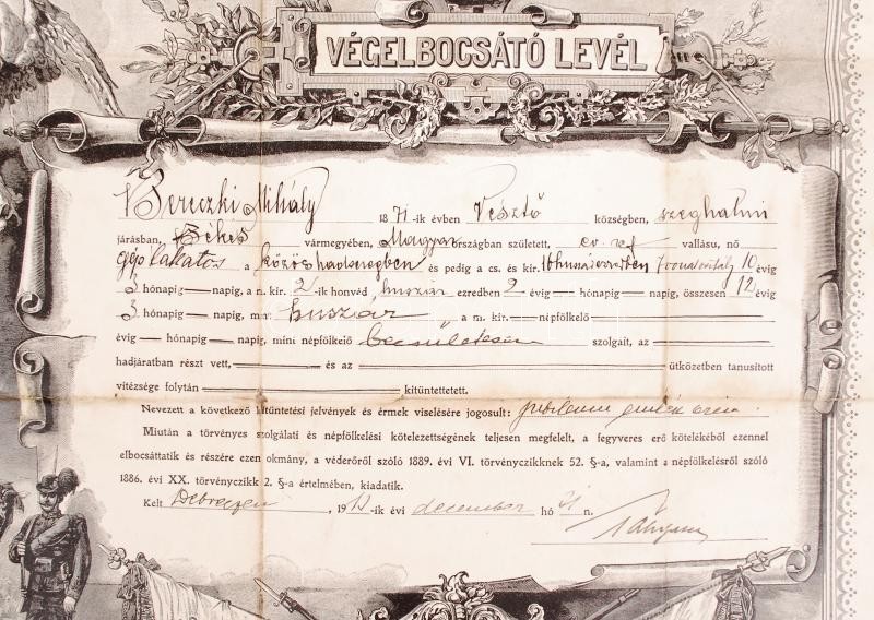 1910 Debrecen, Végelbocsátó levél az Osztrák-Magyar Monarchia hadsereg...
