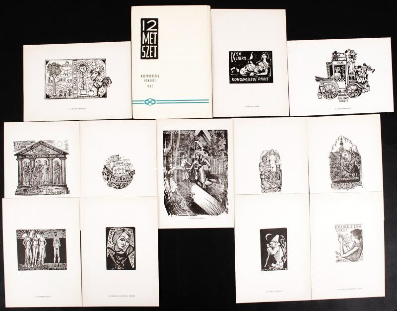 1962 12 metszet magyar grafikusoktól, benne: Gross Arnold, Menyhárt József, Bordás Ferenc, Gácsi Mihály, Drahos István, Varga Gyula, Varga Nándor Lajos, Fery Antal, Trojan Marian József, Diskay István, Strebencz Károly, Stettner Béla. Sorszámozott 253/500