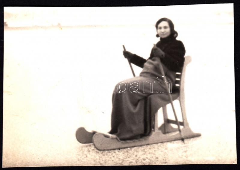 cca 1920-1930 Téli örömök a Balatonon, fakutyázó hölgy Balatonszéplak...