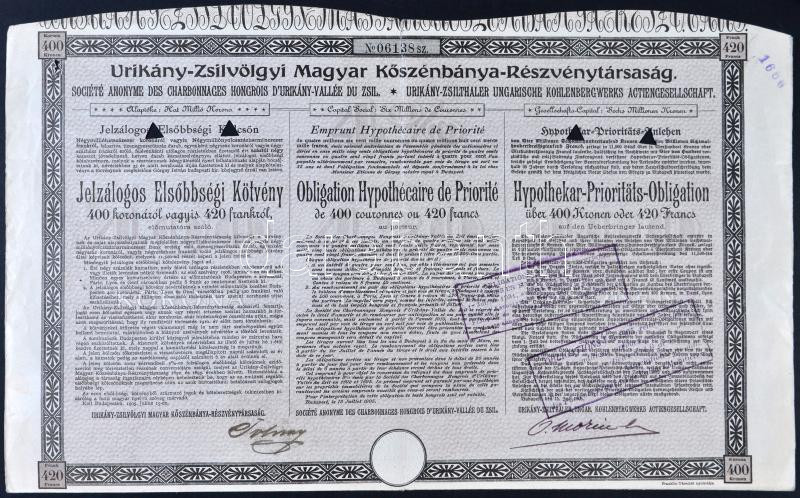 https://www.darabanth.com/en/205-Online-auction/205.0/Numismatics/Shares-and-Tickets~20005/Budapest-1905-Urikany-Zsilvolgyi-Magyar-Koszenbanya-Reszvenytarsasag-Jelzalogos-Elsobb~II823127