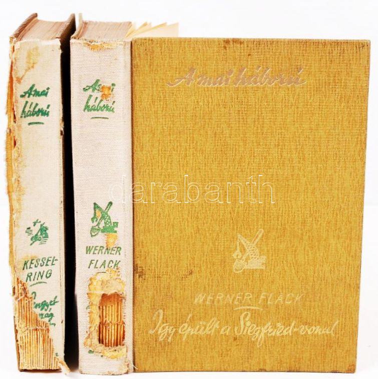 Description: A mai háború sorozat 2 kötete: KIsserling: Lengyelország felett, Werner Flack: Így épült a Siegfried vonal. Bp., 1942. Révai. Mindkettő sérült félvászon kötésben