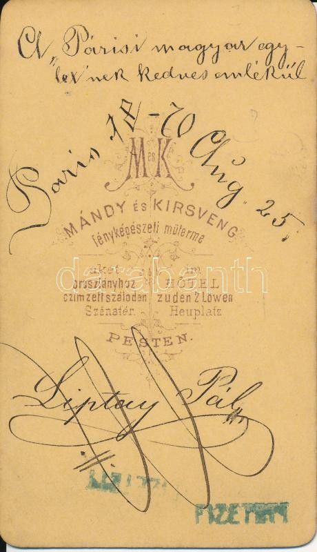 Description: 1870 Liptay Pál polgári hírlapíró portréja, aki részt vett a Budapesti Munkásegylet alapításában és tevékenyen közreműködött a párizsi magyar egylet életében, dedikált kép a PME-nek, 10x6 cm