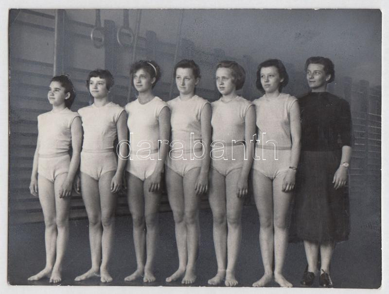 Description: 1956 Német József fotóművész (1911-2006) vintage felvétele a budapesti Gomb utcai általános iskola tornász csapatáról, pecséttel jelzett, feliratozott, a háttér amerikai retussal halványítva, 11x8 cm