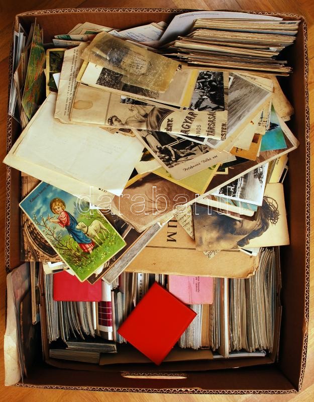 Cca 1910-1960 vegyes nyomtatvány és képeslap tétel, banános ládában