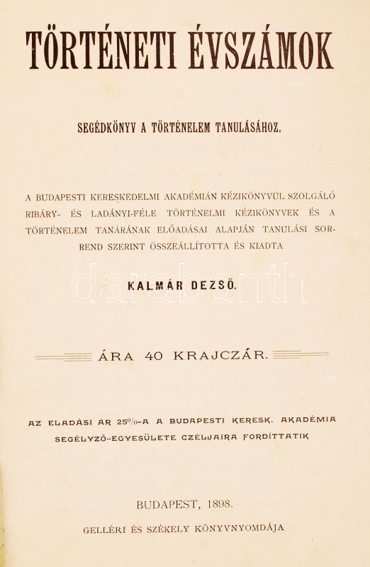 Kalmár Dezső: Történeti évszámok - segédkönyv a történelem tanításához. Bp., 1898 Gelléri és Székely. 32p. hátsó borító nélkül