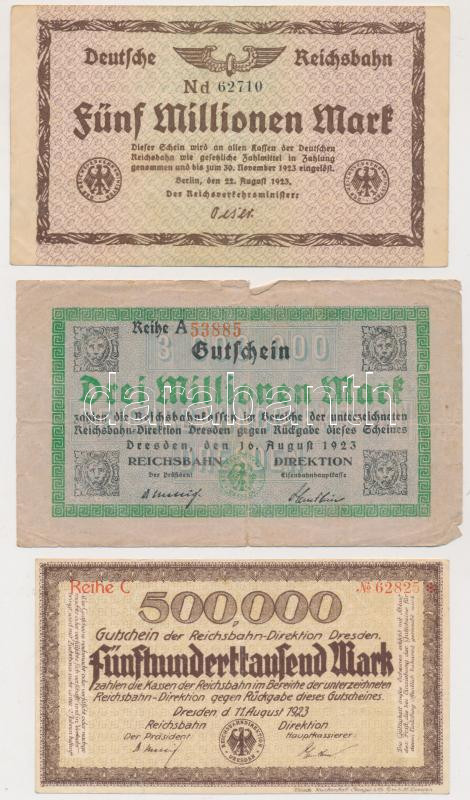 Description: Német Birodalom / Weimari Köztársaság / Birodalmi Vasút / Drezda 1923. 500.000M + 3.000.000M + Berlin 1923. 5.000.000M T:vegyes