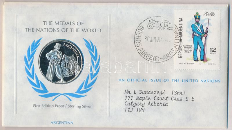 United Nations 1976. "The Medals of the Nations of the World - Argentina" Ag medallion (15g/0.925/32mm) coin letter with first day of issue stamp and certificate C:PP