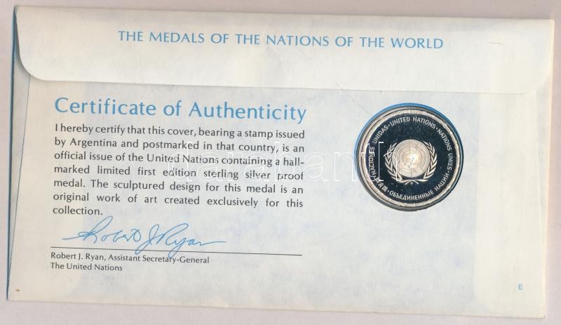 Description: ENSZ 1976. "A Világ nemzeteinek emlékérmei - Argentína" Ag emlékérem (15g/0.925/32mm) megcímzett érmés borítékon elsőnapi bélyegzős bélyeggel, hátoldali tanúsítvánnyal, ismertetőkkel T:PP