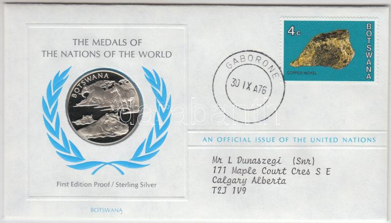 Description: ENSZ 1976. "A Világ nemzeteinek emlékérmei - Botswana" Ag emlékérem (15g/0.925/32mm) megcímzett érmés borítékon elsőnapi bélyegzős bélyeggel, hátoldali tanúsítvánnyal, ismertetőkkel T:PP
