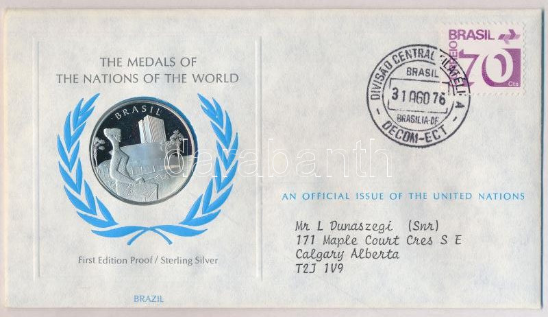 Description: ENSZ 1976. "A Világ nemzeteinek emlékérmei - Brazília" Ag emlékérem (15g/0.925/32mm) megcímzett érmés borítékon elsőnapi bélyegzős bélyeggel, hátoldali tanúsítvánnyal, ismertetőkkel T:PP