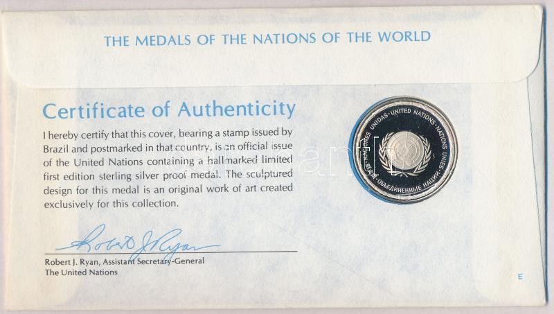 United Nations 1976. "The Medals of the Nations of the World - Brazil" Ag medallion (15g/0.925/32mm) coin letter with first day of issue stamp and certificate C:PP