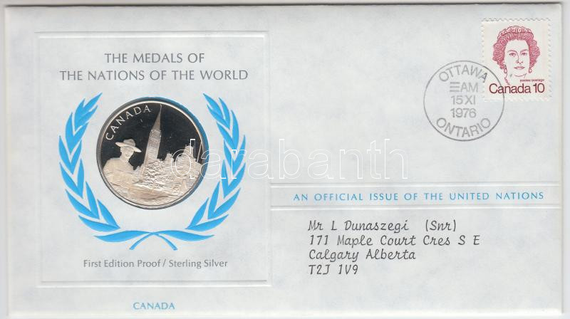 Description: ENSZ 1976. "A Világ nemzeteinek emlékérmei - Kanada" Ag emlékérem (15g/0.925/32mm) megcímzett érmés borítékon elsőnapi bélyegzős bélyeggel, hátoldali tanúsítvánnyal, ismertetőkkel T:PP