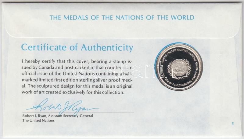 United Nations 1976. "The Medals of the Nations of the World - Canada" Ag medallion (15g/0.925/32mm) coin letter with first day of issue stamp and certificate C:PP