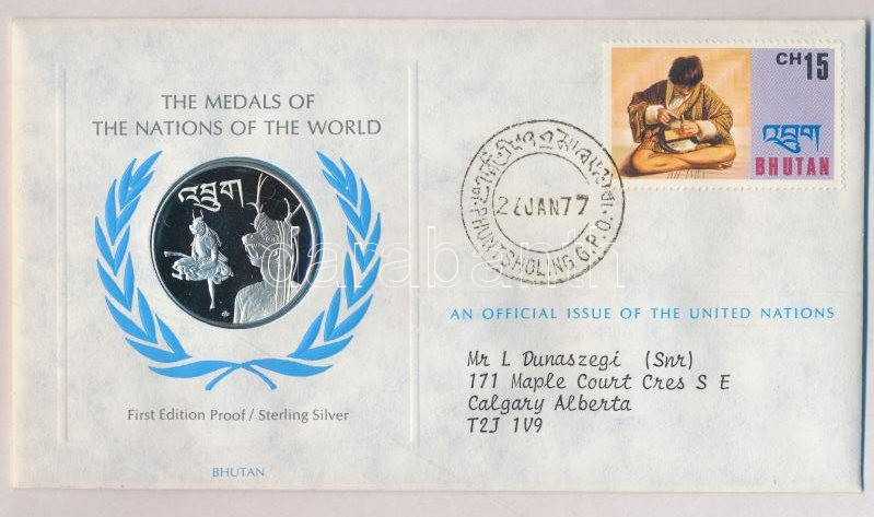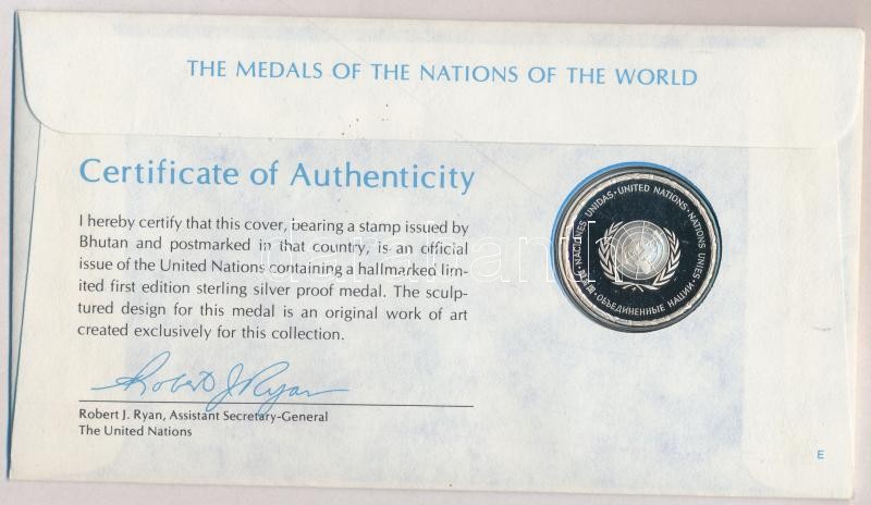 Description: ENSZ 1977. "A Világ nemzeteinek emlékérmei - Bhután" Ag emlékérem (15g/0.925/32mm) megcímzett érmés borítékon elsőnapi bélyegzős bélyeggel, hátoldali tanúsítvánnyal, ismertetőkkel T:PP