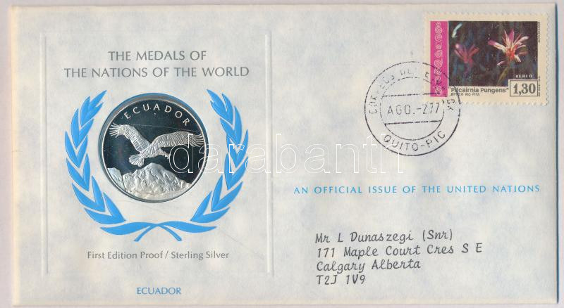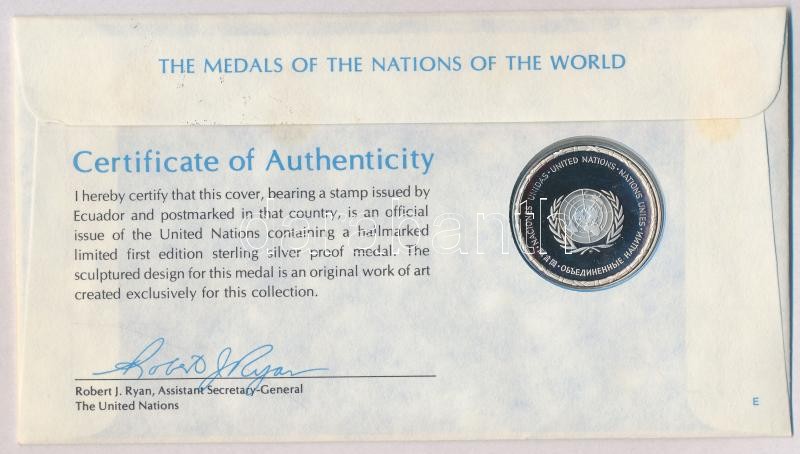 Description: ENSZ 1977. "A Világ nemzeteinek emlékérmei - Ecuador" Ag emlékérem (15g/0.925/32mm) megcímzett érmés borítékon elsőnapi bélyegzős bélyeggel, hátoldali tanúsítvánnyal, ismertetőkkel T:PP