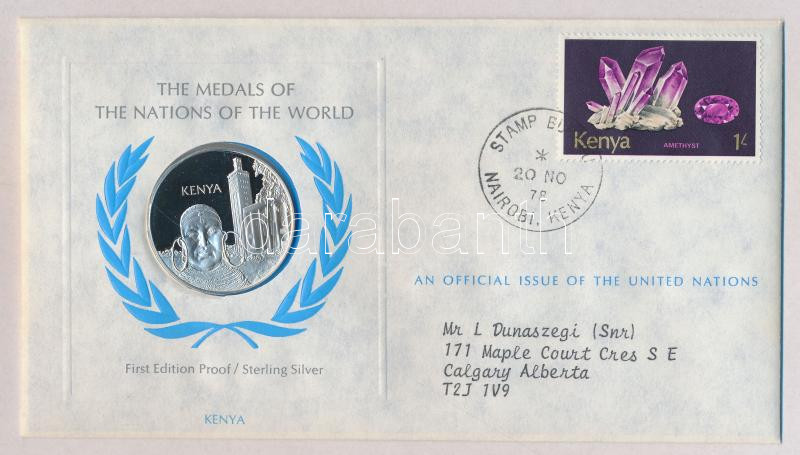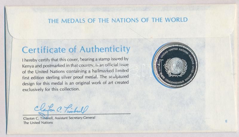 Description: ENSZ 1978. "A Világ nemzeteinek emlékérmei - Kenya" Ag emlékérem (15g/0.925/32mm) megcímzett érmés borítékon elsőnapi bélyegzős bélyeggel, hátoldali tanúsítvánnyal, ismertetőkkel T:PP