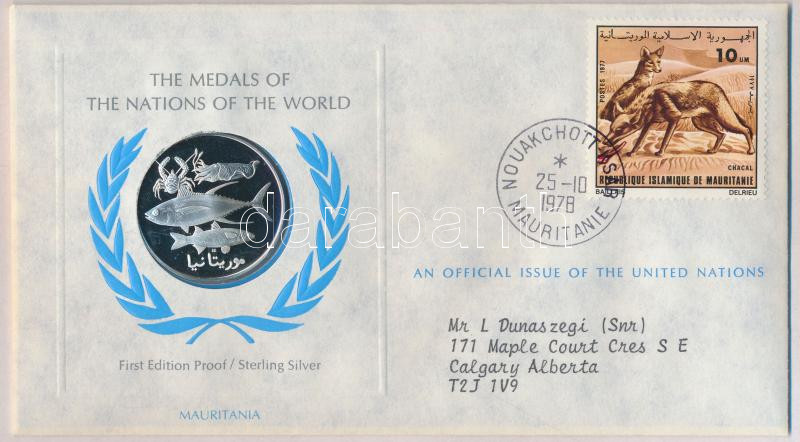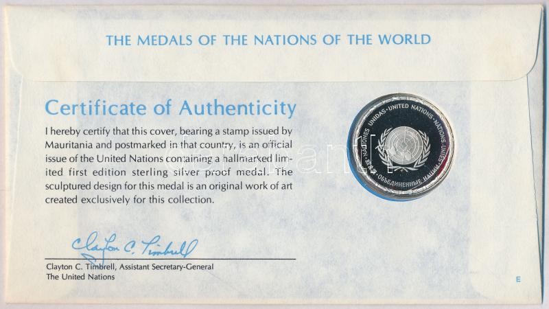 Description: ENSZ 1978. "A Világ nemzeteinek emlékérmei - Mauritánia" Ag emlékérem (15g/0.925/32mm) megcímzett érmés borítékon elsőnapi bélyegzős bélyeggel, hátoldali tanúsítvánnyal, ismertetőkkel T:PP