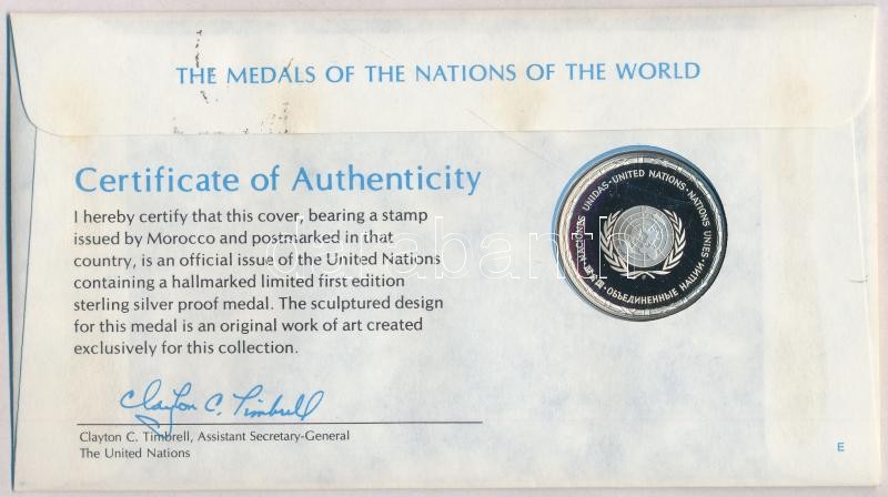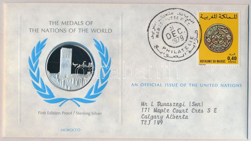 Description: ENSZ 1979. "A Világ nemzeteinek emlékérmei - Marokkó" Ag emlékérem (15g/0.925/32mm) megcímzett érmés borítékon elsőnapi bélyegzős bélyeggel, hátoldali tanúsítvánnyal, ismertetőkkel T:PP