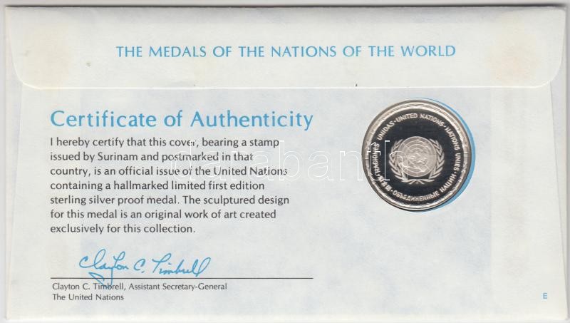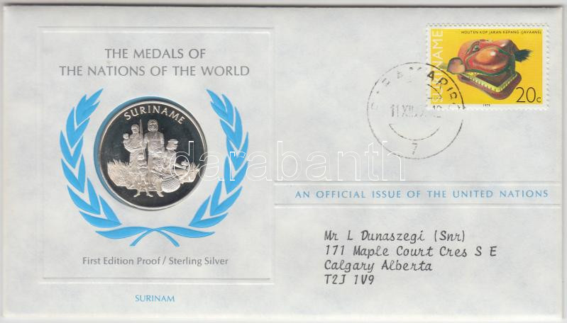 Description: ENSZ 1979. "A Világ nemzeteinek emlékérmei - Suriname" Ag emlékérem (15g/0.925/32mm) megcímzett érmés borítékon elsőnapi bélyegzős bélyeggel, hátoldali tanúsítvánnyal, ismertetőkkel T:PP