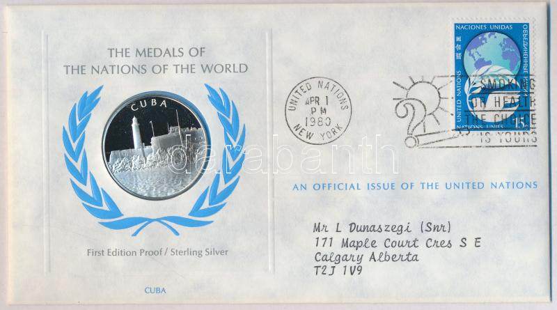 Description: ENSZ 1980. "A Világ nemzeteinek emlékérmei - Kuba" Ag emlékérem (15g/0.925/32mm) megcímzett érmés borítékon elsőnapi bélyegzős bélyeggel, hátoldali tanúsítvánnyal, ismertetőkkel T:PP