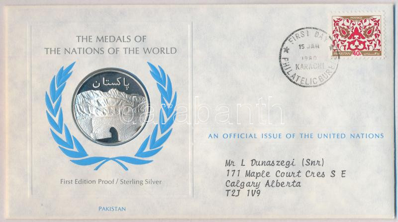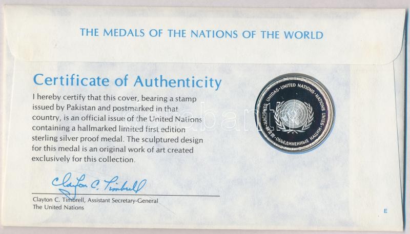 Description: ENSZ 1980. "A Világ nemzeteinek emlékérmei - Pakisztán" Ag emlékérem (15g/0.925/32mm) megcímzett érmés borítékon elsőnapi bélyegzős bélyeggel, hátoldali tanúsítvánnyal, ismertetőkkel T:PP