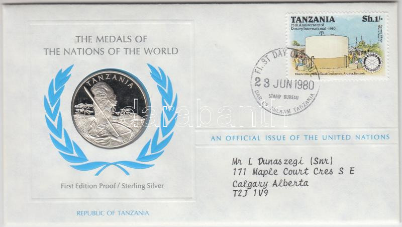 Description: ENSZ 1980. "A Világ nemzeteinek emlékérmei - Tanzánia" Ag emlékérem (15g/0.925/32mm) megcímzett érmés borítékon elsőnapi bélyegzős bélyeggel, hátoldali tanúsítvánnyal, ismertetőkkel T:PP