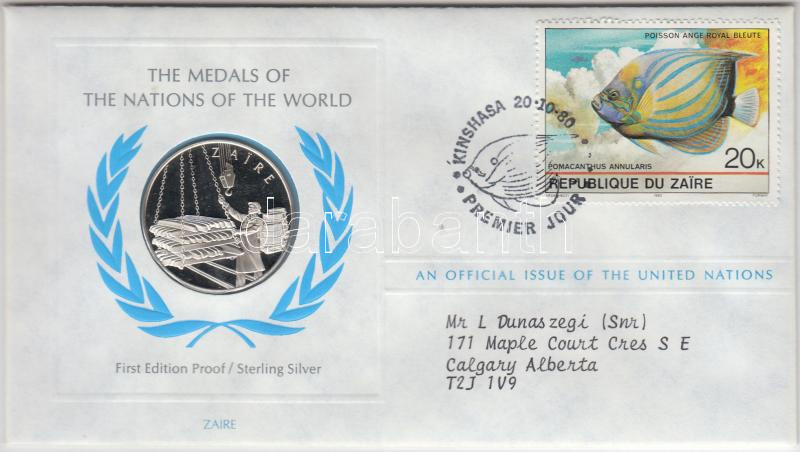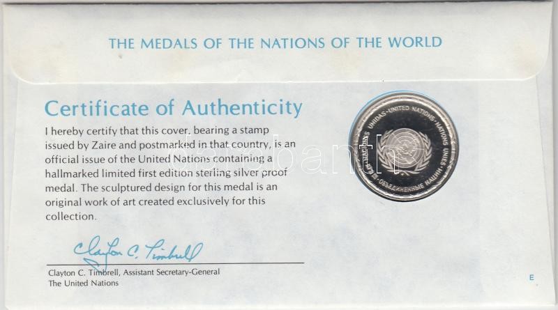 Description: ENSZ 1980. "A Világ nemzeteinek emlékérmei - Zaire" Ag emlékérem (15g/0.925/32mm) megcímzett érmés borítékon elsőnapi bélyegzős bélyeggel, hátoldali tanúsítvánnyal, ismertetőkkel T:PP