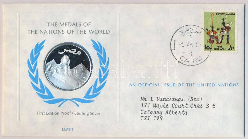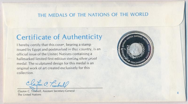 Description: ENSZ 1981. "A Világ nemzeteinek emlékérmei - Egyiptom" Ag emlékérem (15g/0.925/32mm) megcímzett érmés borítékon elsőnapi bélyegzős bélyeggel, hátoldali tanúsítvánnyal, ismertetőkkel T:PP