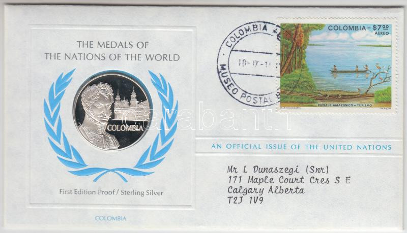 Description: ENSZ 1981. "A Világ nemzeteinek emlékérmei - Kolumbia" Ag emlékérem (15g/0.925/32mm) megcímzett érmés borítékon elsőnapi bélyegzős bélyeggel, hátoldali tanúsítvánnyal, ismertetőkkel T:PP