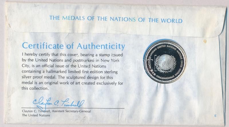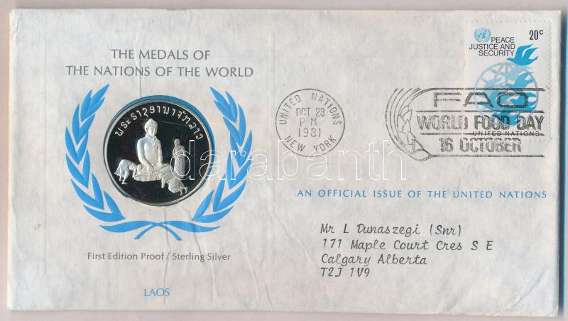 Description: ENSZ 1981. "A Világ nemzeteinek emlékérmei - Laosz" Ag emlékérem (15g/0.925/32mm) megcímzett érmés borítékon elsőnapi bélyegzős bélyeggel, hátoldali tanúsítvánnyal, ismertetőkkel T:PP