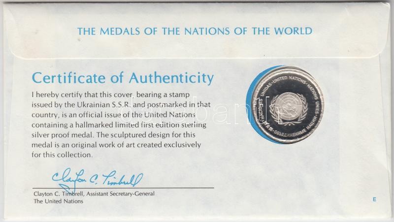ENSZ 1981. "A Világ nemzeteinek emlékérmei - Ukrán SZSZK" Ag emlékérem (15g/0.925/32mm) megcímzett érmés borítékon elsőnapi bélyegzős bélyeggel, hátoldali tanúsítvánnyal, ismertetőkkel T:PP