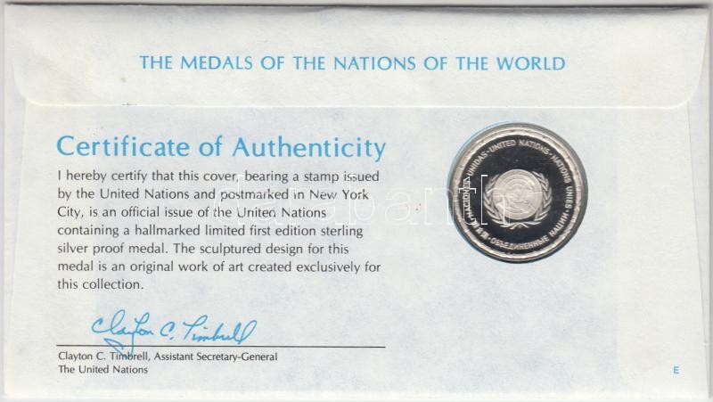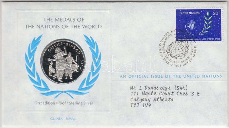 ENSZ 1982. "A Világ nemzeteinek emlékérmei - Guinea-Bissau Ag emlékérem (15g/0.925/32mm) megcímzett érmés borítékon elsőnapi bélyegzős bélyeggel, hátoldali tanúsítvánnyal, ismertetőkkel T:PP