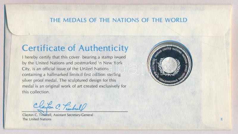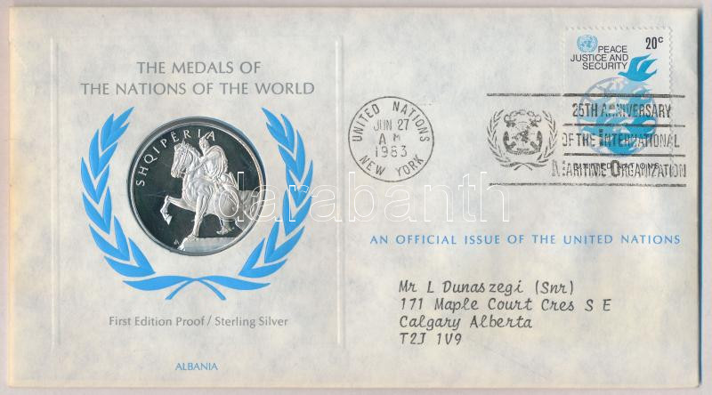 Description: ENSZ 1983. "A Világ nemzeteinek emlékérmei - Albánia" Ag emlékérem (15g/0.925/32mm) megcímzett érmés borítékon elsőnapi bélyegzős bélyeggel, hátoldali tanúsítvánnyal, ismertetőkkel T:PP