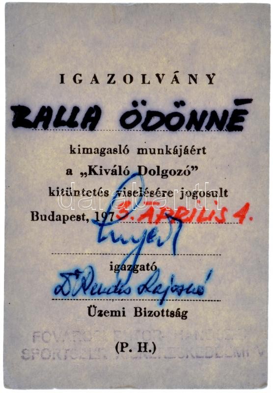 1973. "Kiváló Dolgozó" zománcozott kitüntetés és igazolvány a Fővárosi...