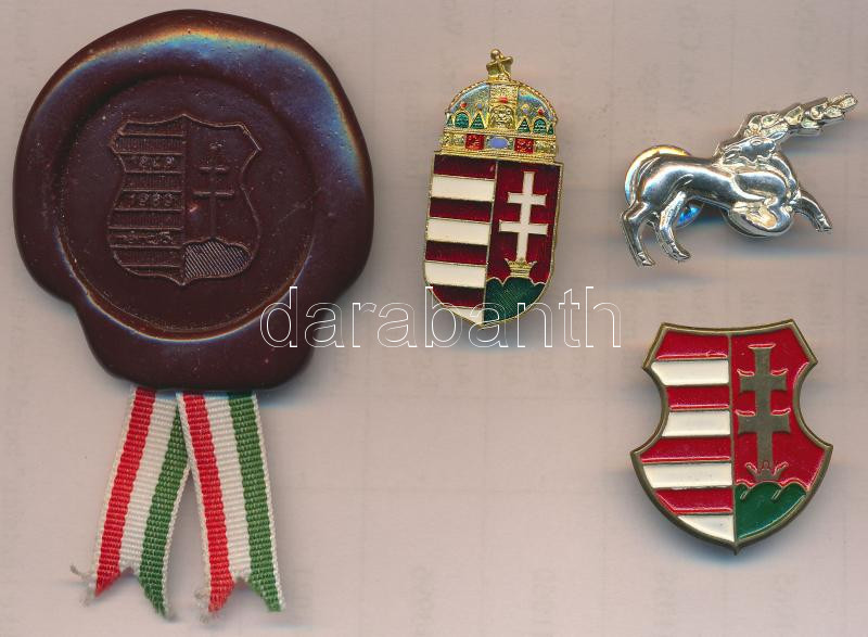 Description: 4 db klf kitűző: egy műanyag és egy fém Kossuth címer, egy zománcozott, rendszerváltás utáni fém magyar címer, és egy ezüstözött fém csodaszarvas kitűző T:1,1-,2