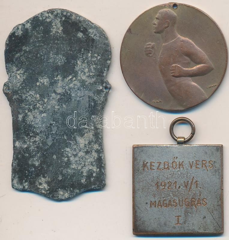 Berán Lajos (1882-1943) / Scheid. G.A. (Ezüstárú és Éremgyár) 1910. "M.Á.V. Gépgyári Sportkör" Br emlékérem, lyukas (37mm) + 1921. "A Magyar Athletika Szövetség Díja / Kezdők versenye magasugrás I." ezüstözött fém díjérem (31x33mm) + Osztrák-Magyar Monarchia 1914-1917. "In Memoriam 1914-1917" bronz katonai felvarró (65x37mm) T:2,2-,3