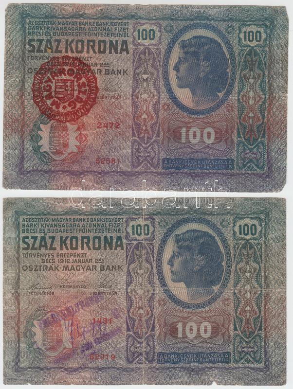 1912. 100K (2x) az egyik "MAGYARORSZÁG" piros körbélyegzővel... https://www.darabanth.com/en/207-Online-auction/207.0/Numismatics/Hungarian-Banknotes~200009/1912-100K-2x-az-egyik-MAGYARORSZAG-piros-korbelyegzovel-a-masik-kek-felulbelyegzessel~II842941