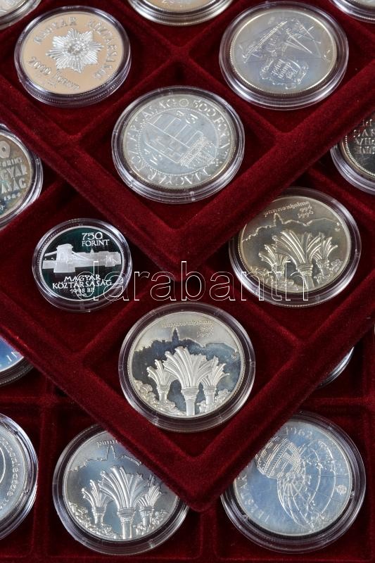 Terjedelmes magyar, főleg ezüst emlékpénz gyűjtemény: 108 db emlékérme és érem piros műbőr kazettában, a teljes tükörveret Festők sor kék éremtartóban, 81 db 98%-ban ezüst emlékpénz, valamint két tükörveret aranyérme: 1990. 5000Ft Au "Mátyás király" + 1994. 5000Ft Au "Veszélyeztetett állatvilág - túzok" T:PP,BU,1