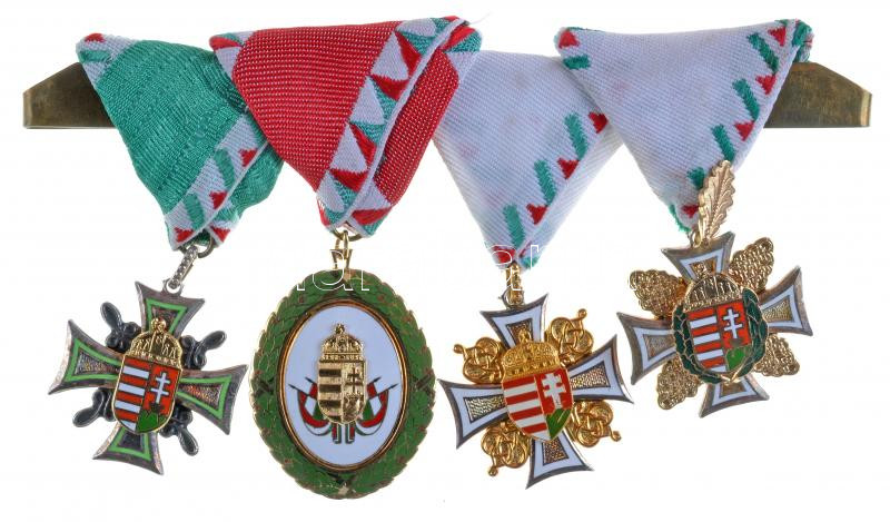 Hungary 1996. "Distinction for NCO's Service, 3rd Grade" enamelled, gold and silver plated tombac decoration with ribbon + 2002. "Distinction for Service of Merit, 1st Grade" enamelled, gold plated tombac decoration with ribbon + 1992. "Distinction for an Officer in Service, 3rd Grade" enamelled, gold and silver plated tombac decoration with ribbon + 1996. "Distinction for an Officer in Service, 1st Grade" enamelled, gold and silver plated tombac decoration with ribbon, all together suspended C:UNC,AU,XF