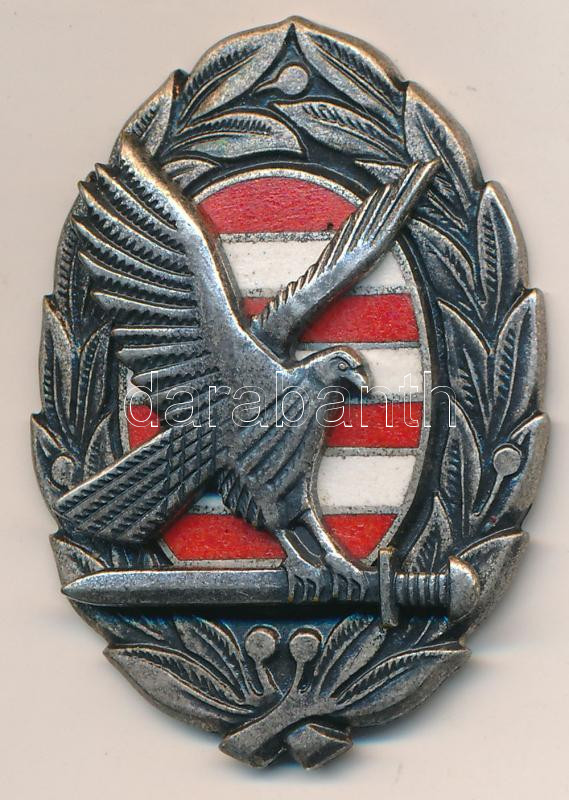 Description: DN Zrínyi Miklós Katonai Akadémia jelvénye, ezüstözött jelvény tűzzománc piros-fehér sávos középrésszel, rajta kiterjesztett szárnyú sas karmai közt kard T:1-
