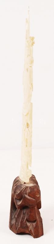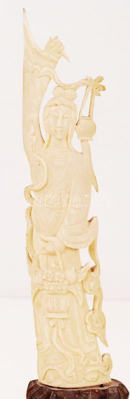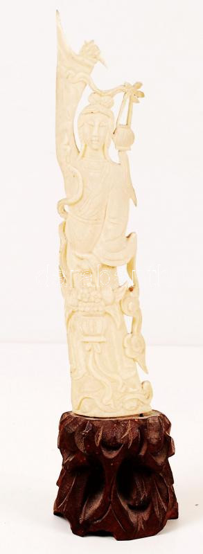 Szerencsét hozó istenség, kézzel faragott csont figura, faragott fa talapzaton, m:20 cm