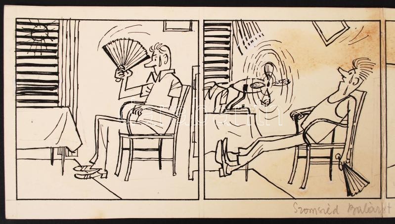 Gerő Sándor (1904-1977): Szomszéd Balázst kirázza a hideg. Tus, papír, jelzett, 9×33 cm