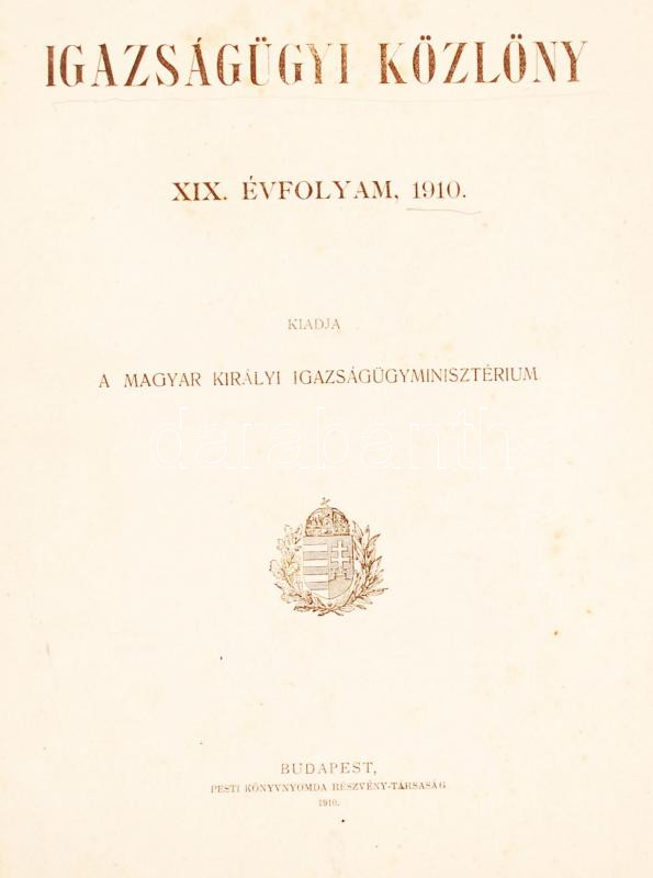 Igazságügyi Közlöny. XIX. évfolyam, 1910. Kiadja a Magyar Királyi Igaz... https://www.darabanth.com/en/207-Online-auction/207.0/Other-collectibles/Books-Law~600031/Igazsagugyi-Kozlony-XIX-evfolyam-1910-Kiadja-a-Magyar-Kiralyi-Igazsagugyminiszterium-B~II821220