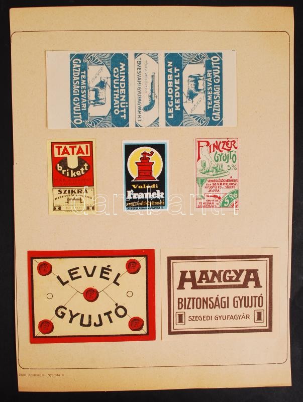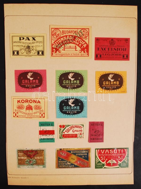 44 db háború előtti gyufacímke, lapokon, bélyegragasztóval